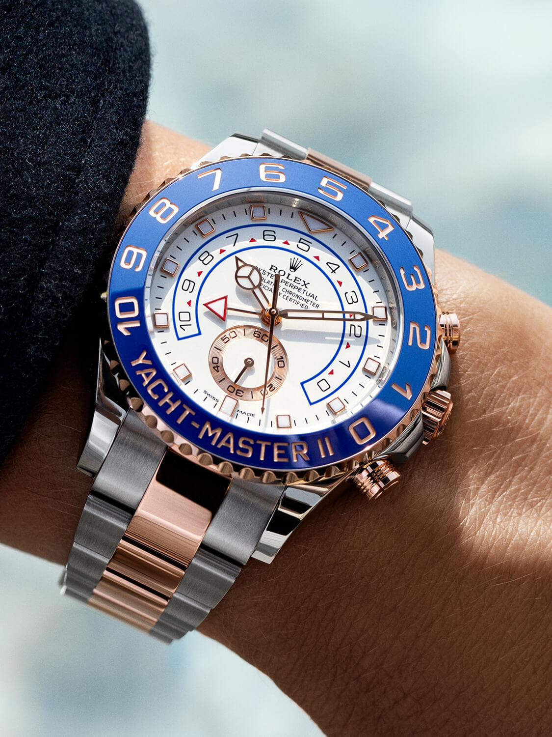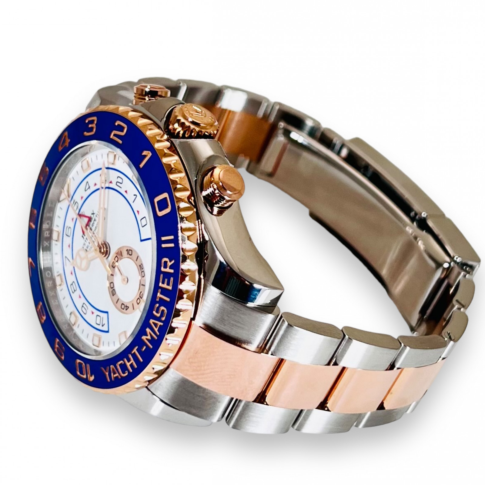 اكتشف أناقة لا تُضاهى مع ساعات روليكس ياخت ماستر II ميرور أوريجنال رائعة ، التحفة الفاخرة التي تجمع بين الدقة الهندسية والتصميم الراقي. هذه الساعة الاستثنائية تتميز بإطار دائري عريض مصنوع من مزيج مذهل من الفولاذ المقاوم للصدأ والذهب الوردي، مما يمنحها لمعاناً ساحراً يعكس الضوء بطريقة تجعلها تبدو كجوهرة بحرية. القرص الأبيض النقي يبرز بشكل مذهل، محاطاً بحلقة زرقاء نابضة بالحيوية تحمل أرقاماً عربية كبيرة وواضحة، تتدرج من 0 إلى 10 في تصميم يوحي بالسرعة والمغامرة. العقارب الذهبية الوردية اللامعة، مع إبرة الثواني الحمراء البارزة، تضيف لمسة من الديناميكية، بينما يظهر اسم “Yacht-Master II” باللون الأزرق الجريء أسفل المركز، مشيراً إلى تراث روليكس في عالم اليخوت والسباقات البحرية.