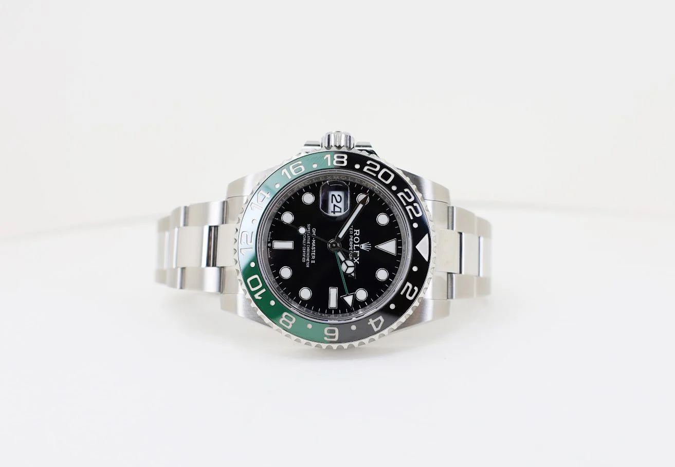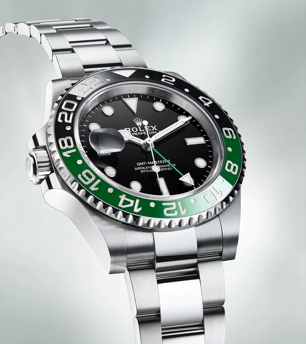 يبرز وجه الساعة المدهش بلونه الأسود العميق، والذي تتناغم عليه المؤشرات الدائرية اللامعة والعقارب المضاءة بخطوط دقيقة لإضفاء سهولة قراءة الوقت في جميع الظروف. تصميم الحافة الدوارة ذات اللونين، بين الأسود والأخضر، يوحي بحيوية وتجدد لا مثيل لهما، ويمنح الساعة طابعًا عصريًا يأسر الأنظار. هذه الحافة تتيح لك حساب توقيت منطقتين زمنيتين بكل سهولة، ما يجعل ساعة رولكس جى ام تى ماستر ميرور اوريجينال خيارًا مثاليًا لرجال الأعمال ومحبي السفر.
