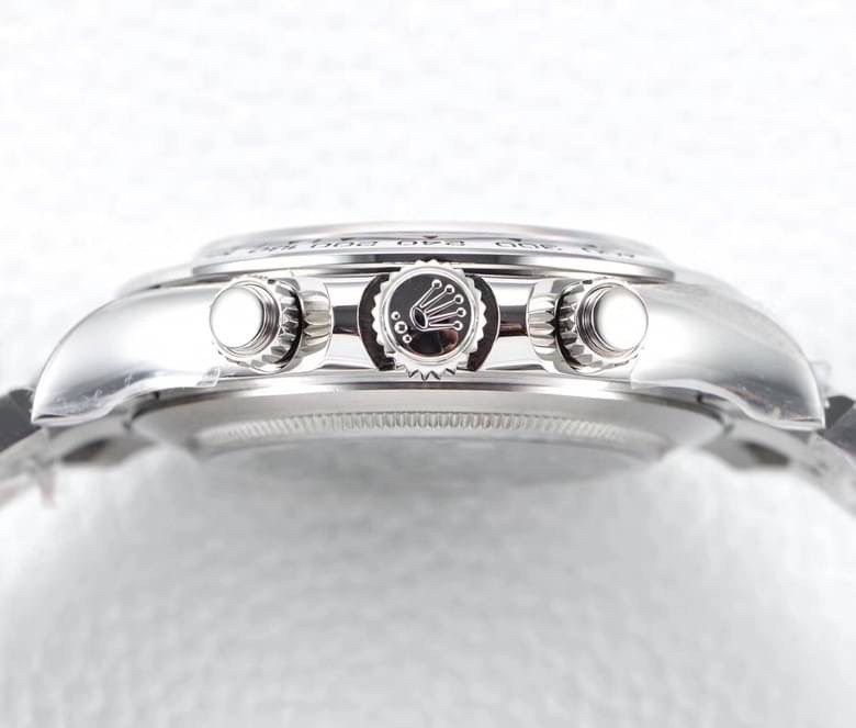 تبرز ساعة رولكس دايتونا ميرور أوريجنال من خلال الكرونوغراف الجانبي الذي يظهر بدقة وتفاصيل واضحة، ما يعزز من عملية مراقبة الوقت والأداء بإتقان. تصميم أزرار التحكم في الجهة الجانبية يعكس الحرفية العالية، وتسمح هذه الأزرار بسهولة ضبط الوقت بفضل ملمسها المحكم والمريح. كما تعكس الخطوط ودرجة اللمعان على السطح المعدني البراعة في إبراز التوازن بين الإطلالة العصرية واللمسة التقليدية التي اشتهرت بها ساعات رولكس حول العالم.