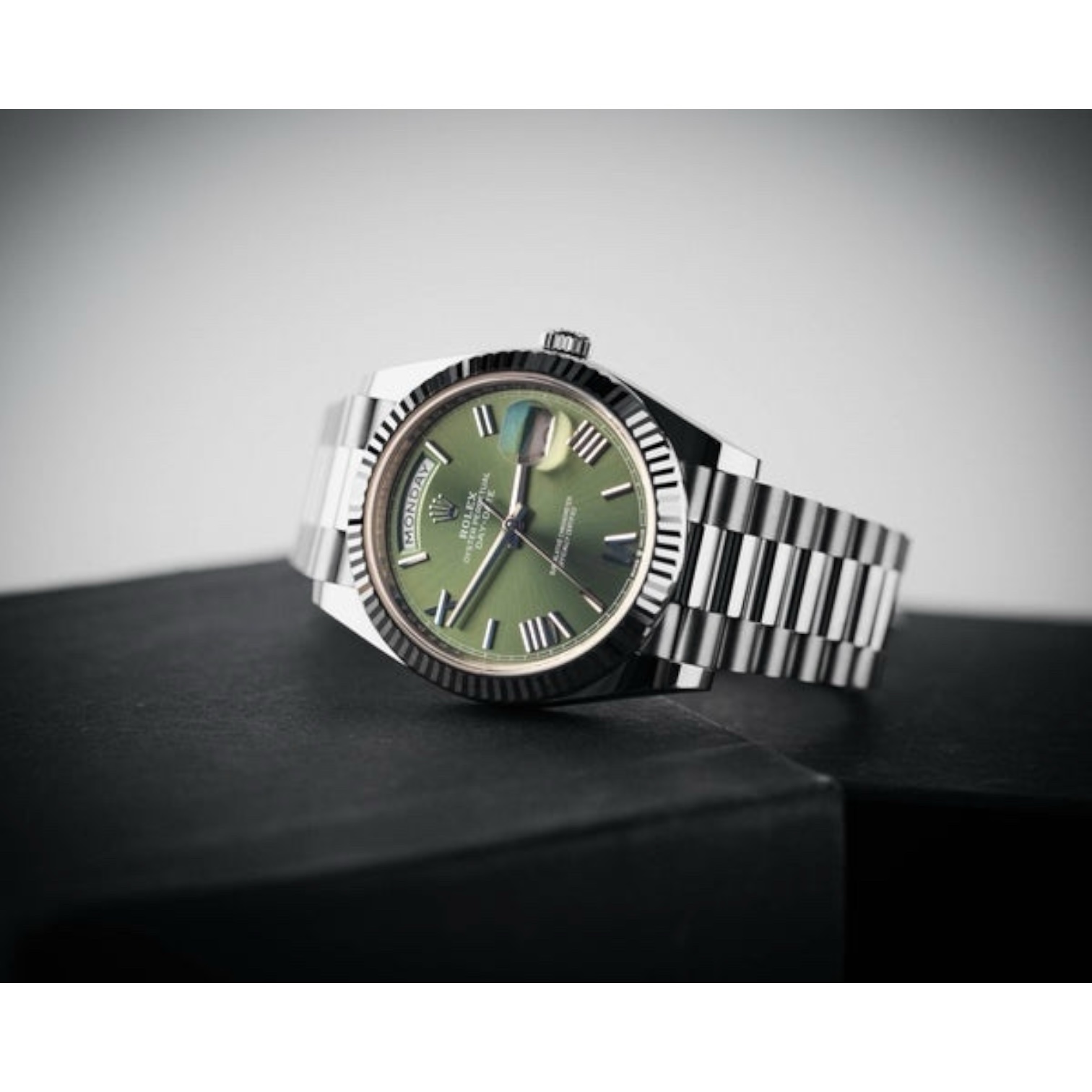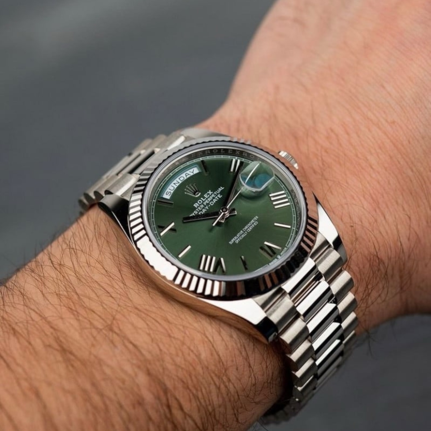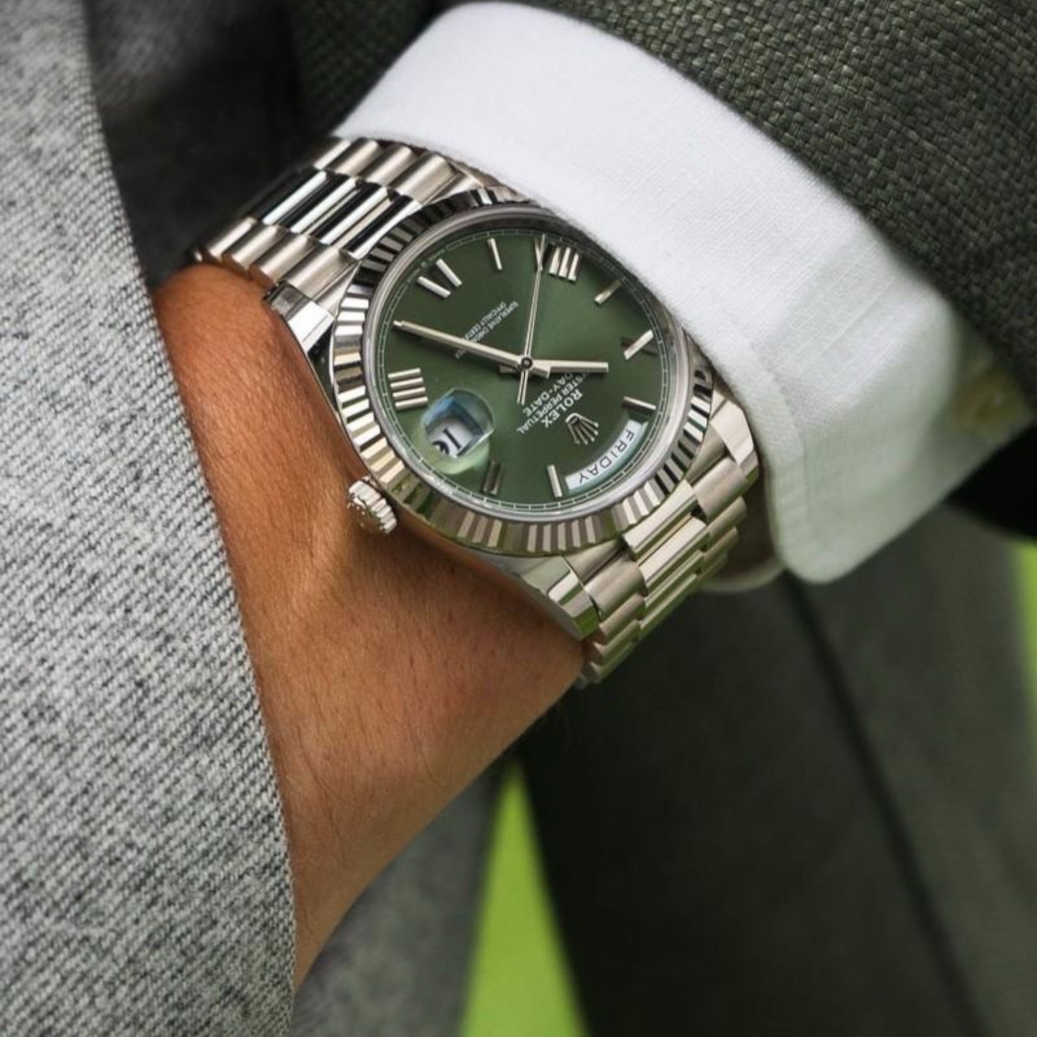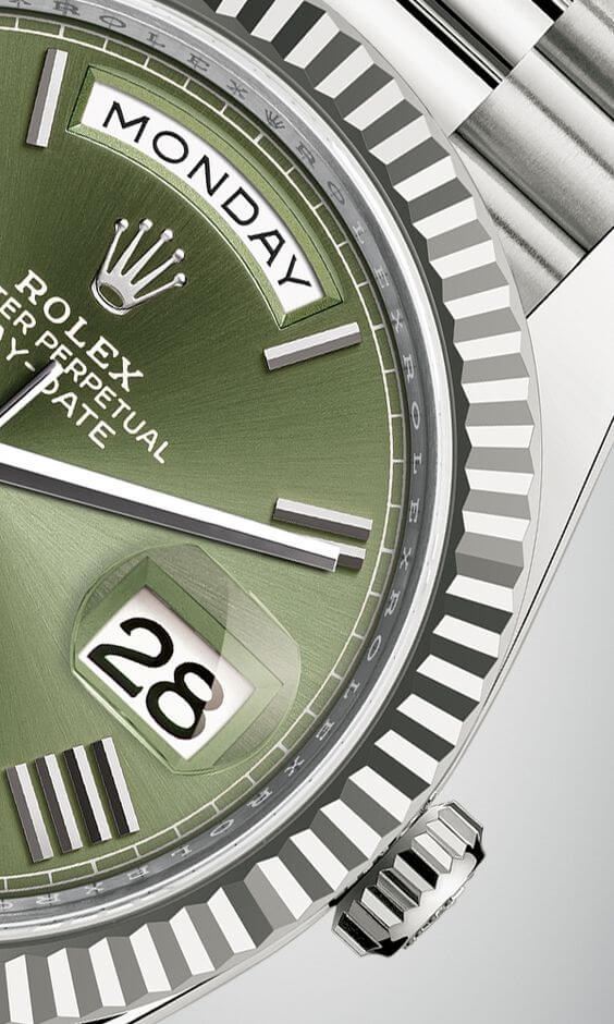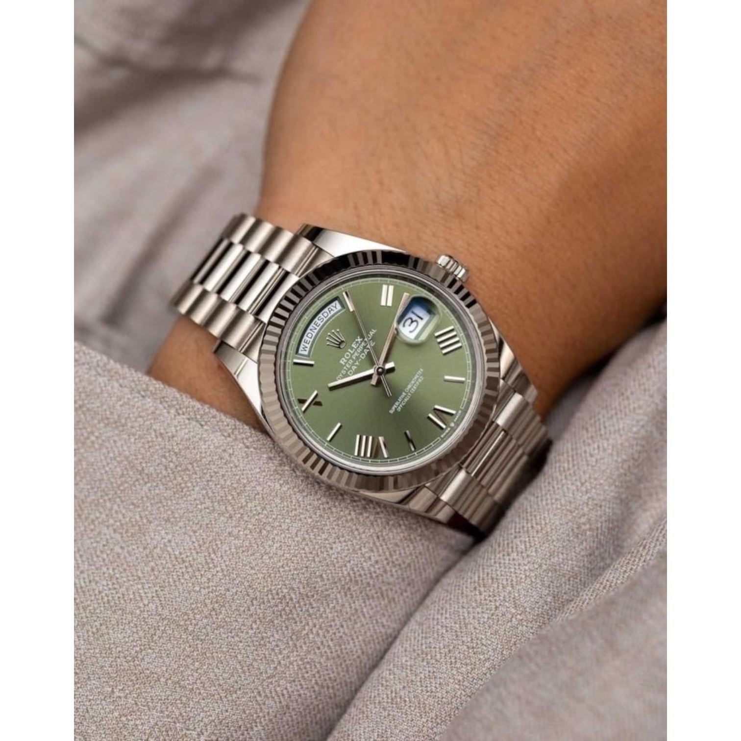 تخيل أنك ترتدي ساعة فاخرة تجذب الأنظار وتعبّر عن الذوق الرفيع، هنا تبرز ساعة رولكس داي ديت ميرور اوريجينال كواحدة من أروع الساعات التي قد تختارها لإطلالتك اليومية أو مناسباتك الخاصة. تأتي هذه الساعة بتصميم مذهل مع قرص باللون الأخضر الهادئ والمميز الذي يعكس الإشراق والأناقة، ويضفي لمسة من الفخامة على معصمك. يظهر الضوء على السطح المصقول للقرص ليمنح الساعة مظهراً لامعاً يوحي بالتميز والترف.