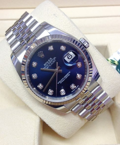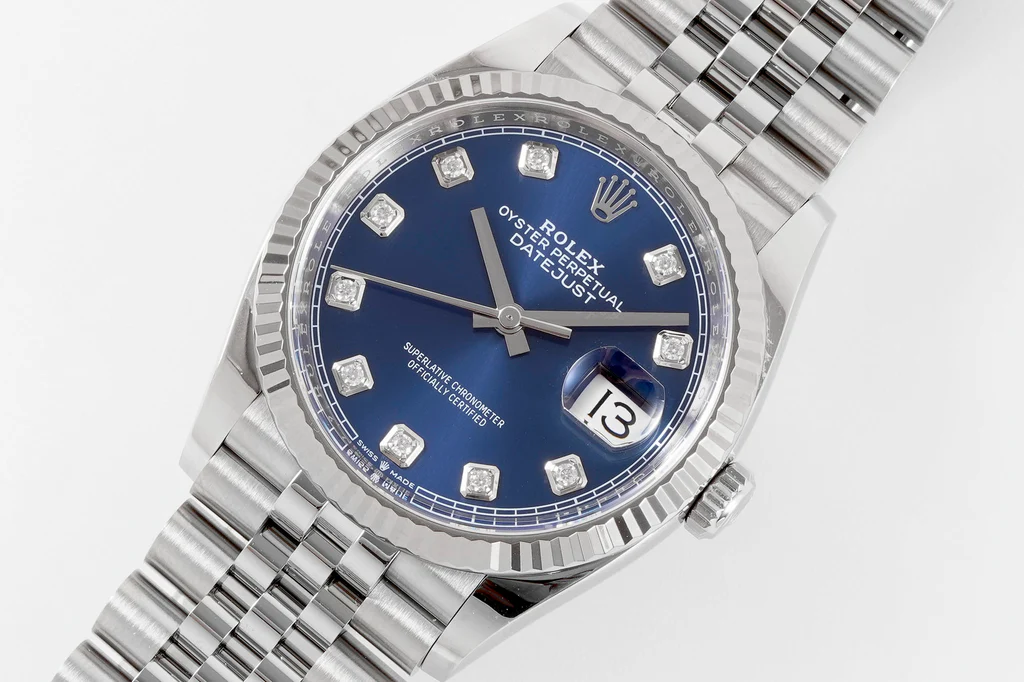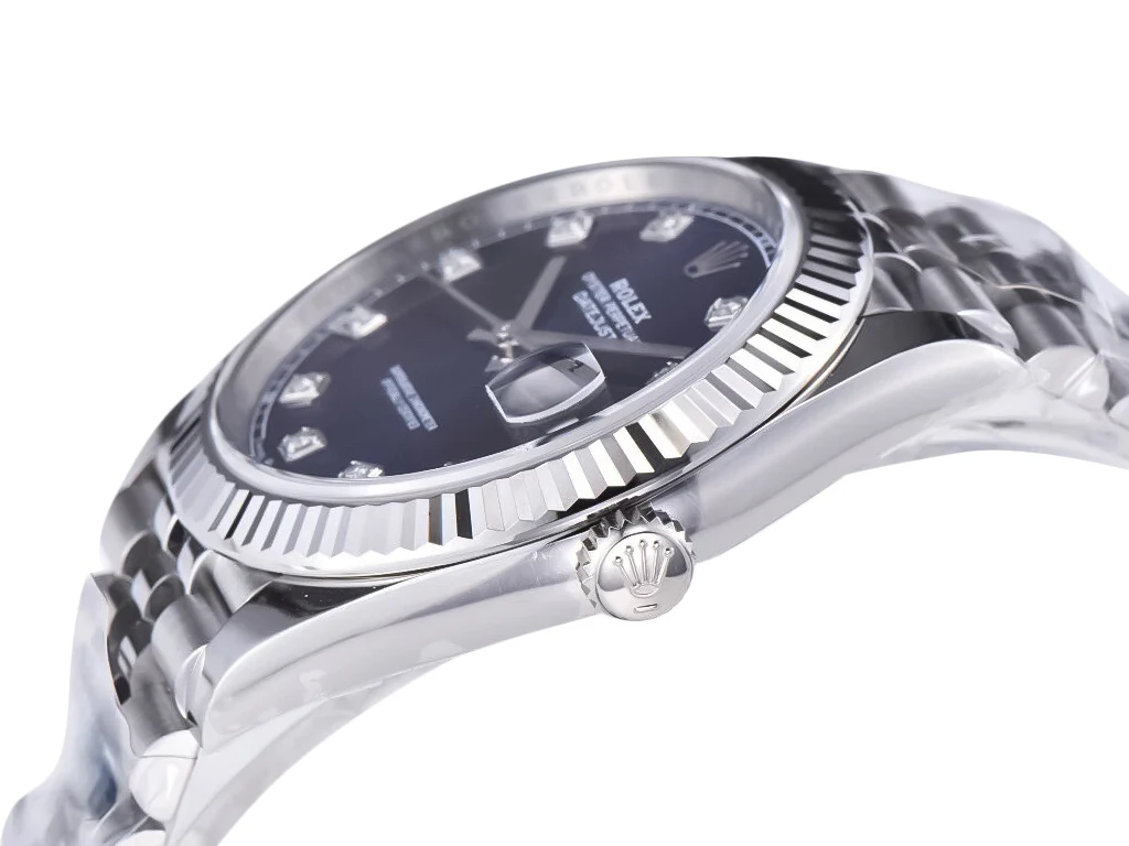 ساعة رولكس ديت جست تمثل قمة الفخامة والدقة في عالم الساعات الأنيقة ، حيث تجمع بين التصميم الكلاسيكي واللمسات الحديثة التي تجعلها قطعة فنية تتألق على المعصم. هذه الساعة، بقطرها البالغ 41 ملم، تتميز بإطار محزز من الذهب الأبيض اللامع الذي يعكس الضوء بطريقة ساحرة، مما يضفي عليها إشراقًا لا يُقاوم. القرص الأزرق الداكن يشبه سماء ليلية مرصعة بالنجوم، مع مؤشرات ساعات من الماس البراق الذي يلمع تحت أي إضاءة، مما يجعل كل نظرة إليها تجربة بصرية مدهشة. العقارب الرفيعة والأنيقة، مصنوعة من الذهب الأبيض، تنزلق بسلاسة فوق السطح، بينما نافذة التاريخ عند موضع الساعة الثالثة تظهر اليوم بوضوح تام، مضيفة لمسة عملية إلى هذا الجمال الفني.