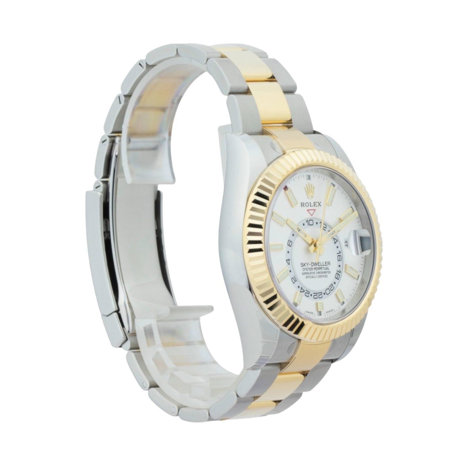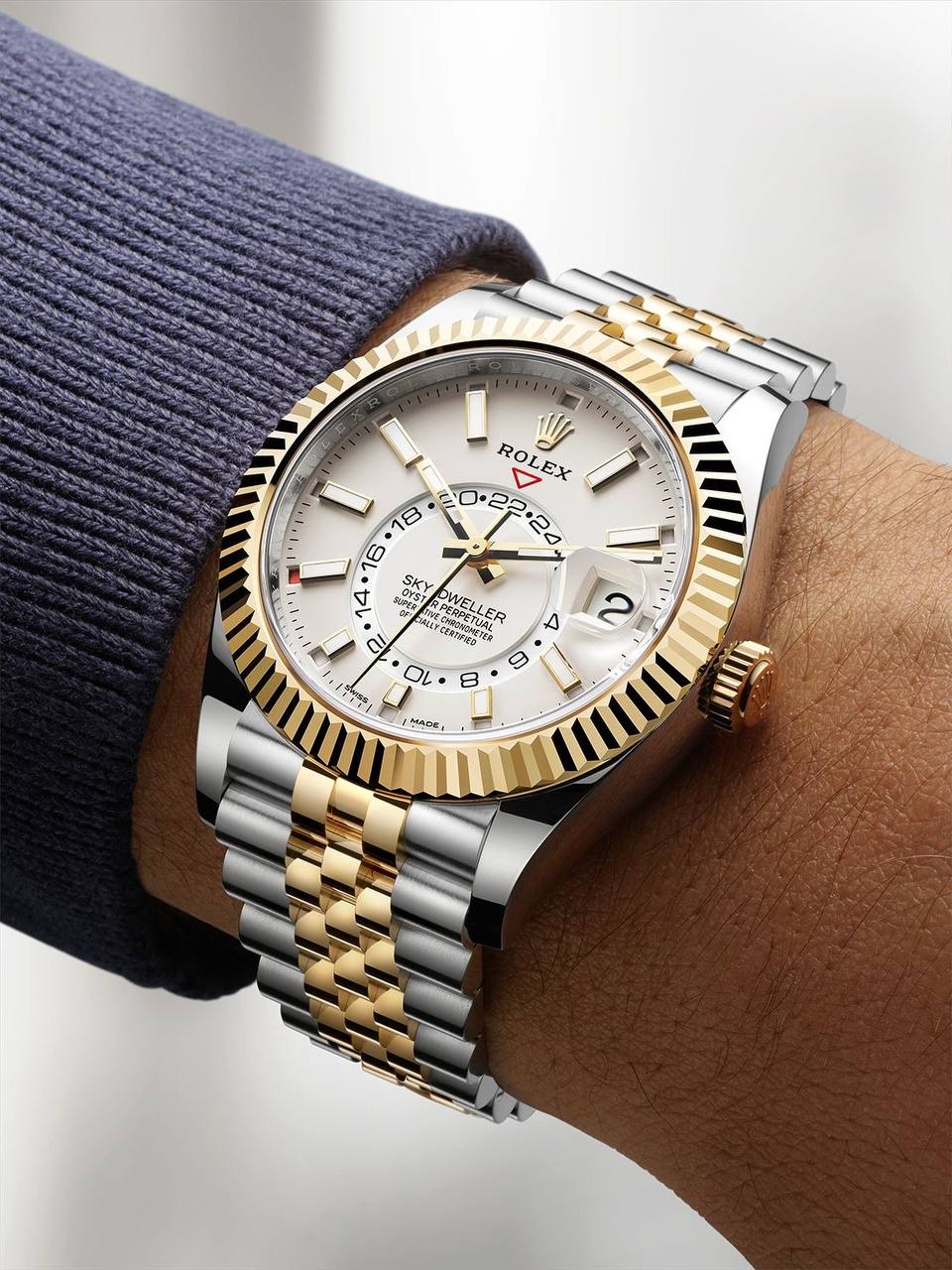 واجهة ساعة رولكس سكاي دويللر ميرور اورجينال الكبيرة تجمع بين بساطة اللون الأبيض والأرقام الواضحة، إلى جانب مؤشر التاريخ البارز عند الرقم 3 الذي يضفي لمسة عملية وعصرية. يحيط بالقرص الداخلي حلقة للوقت بنظام 24 ساعة، ما يجعلها مثالية للمسافرين أو رجال الأعمال بفضل عرض الوقت بدقة عالية لمنطقتين زمنيتين. عقارب الساعة والإشارات الزمنية مطلية بالذهب بشكل أنيق، مع لمسات لامعة تعكس الضوء وتبرز جمال الساعة في كل حركة.