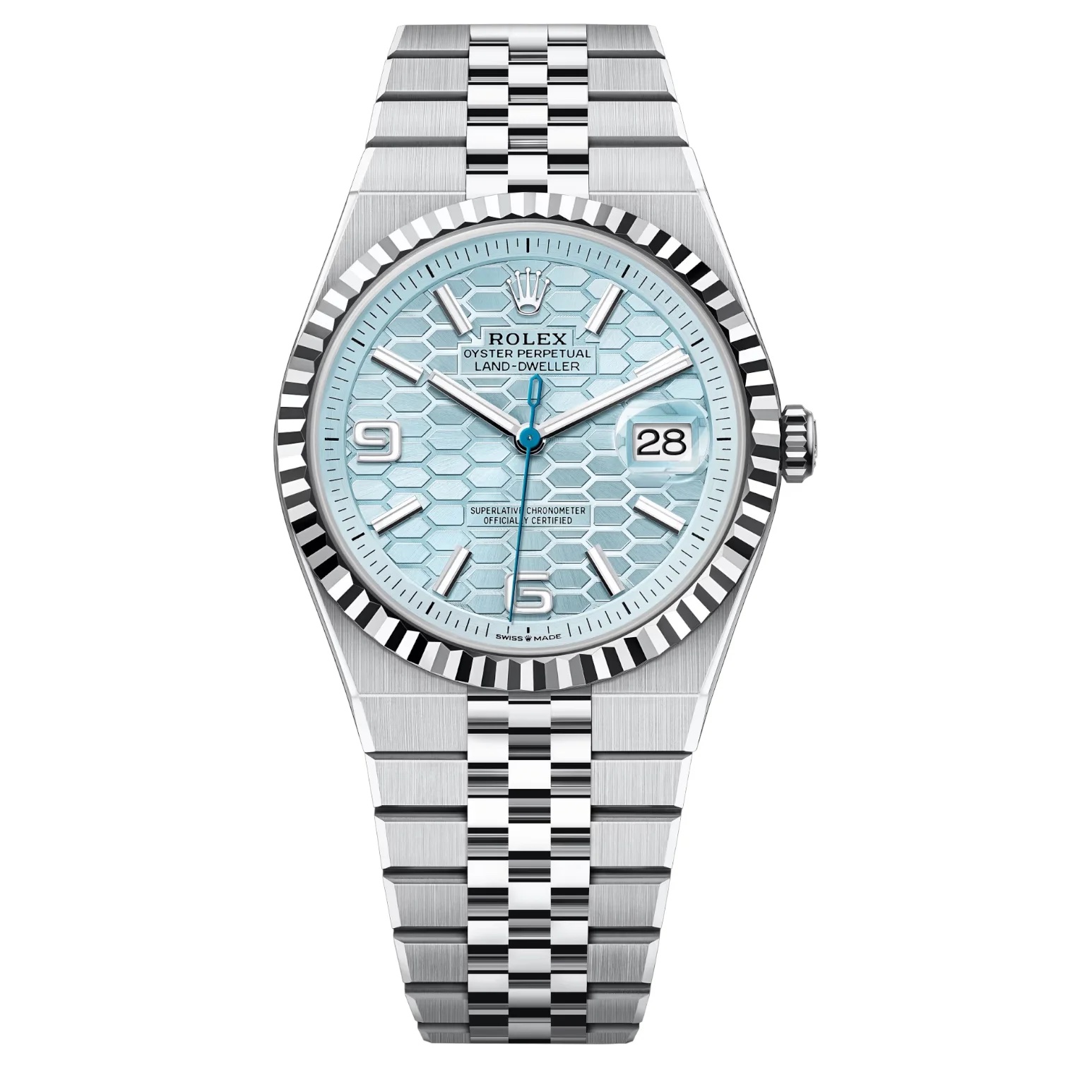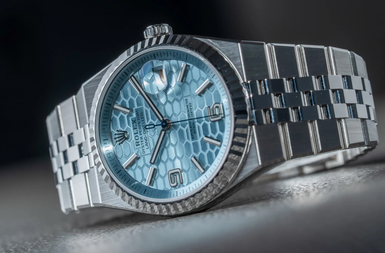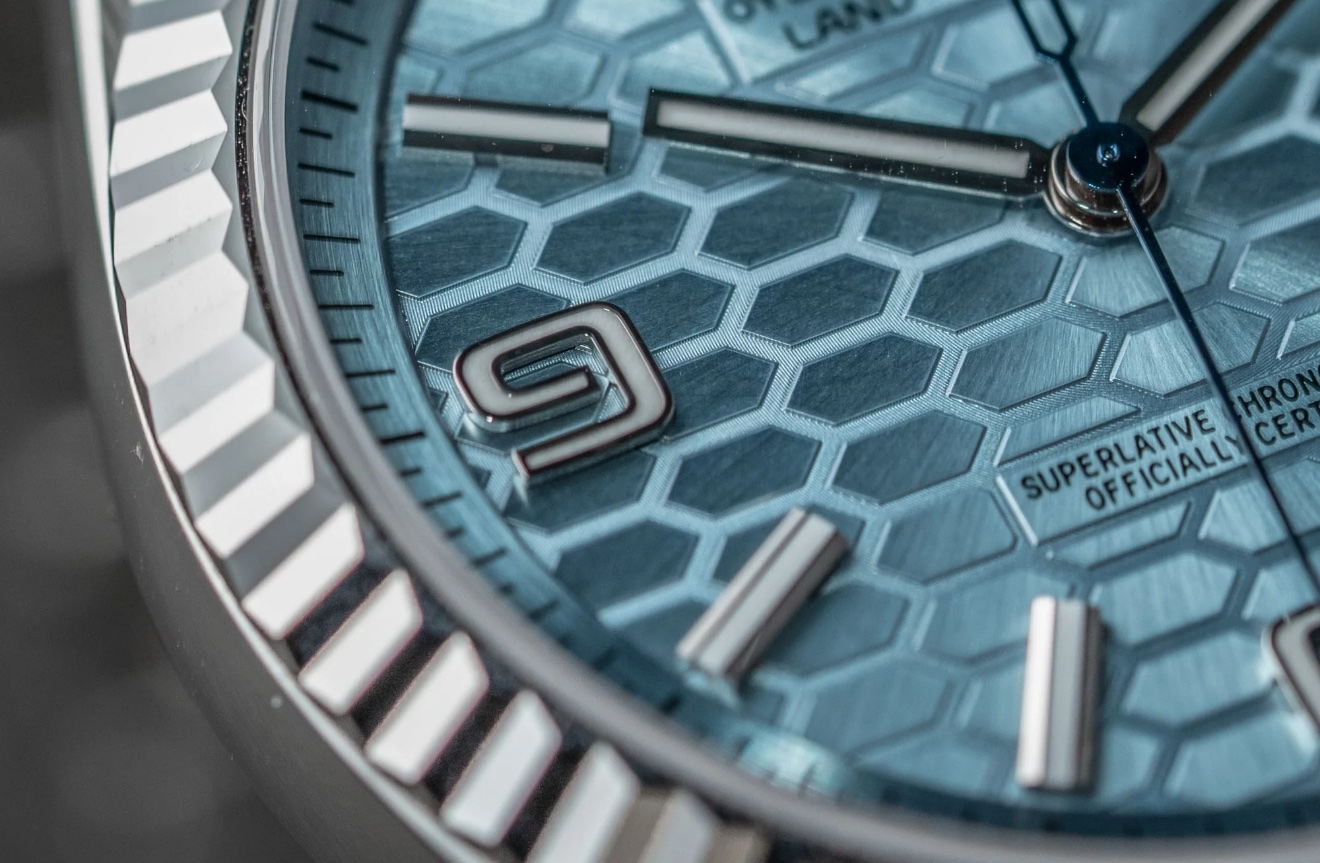 تتميز الساعة بميناء لوني ساحر بدرجة “أيس بلو” (Ice Blue)، وهو اللون الأيقوني المخصص عادةً لساعات رولكس البلاتينية الفاخرة. ما يخطف الأنظار حقاً هو نمط قرص العسل (Honeycomb Motif) المحفور بدقة ليزرية على الميناء، مما يخلق تلاعباً مذهلاً بالضوء والظل ويمنح الساعة عمقاً وبعداً ثلاثياً فريداً. العقارب ومؤشرات الساعات مطلية بمادة مضيئة (Luminescense) لضمان قراءة واضحة في الظلام، تماماً كالأصلية.