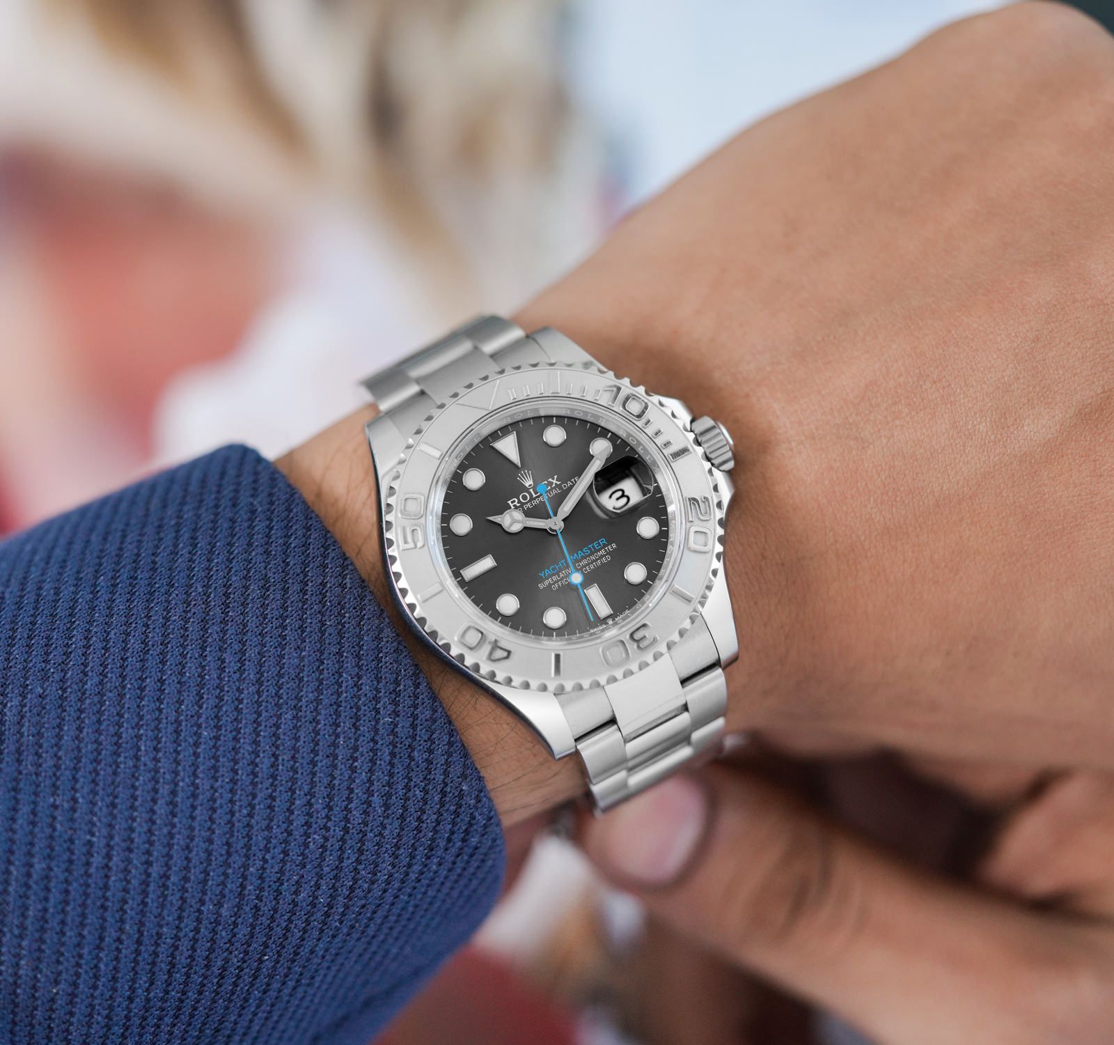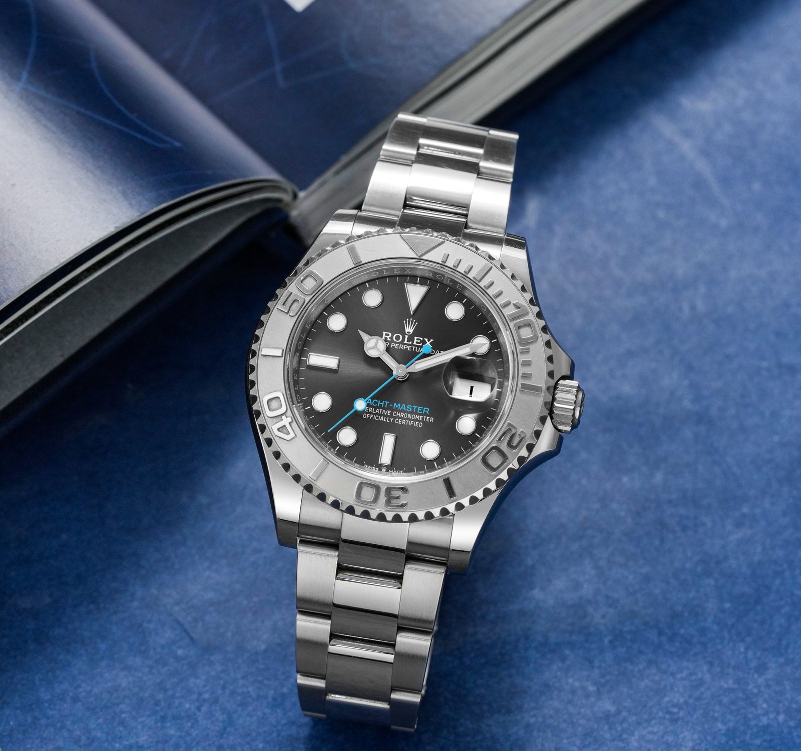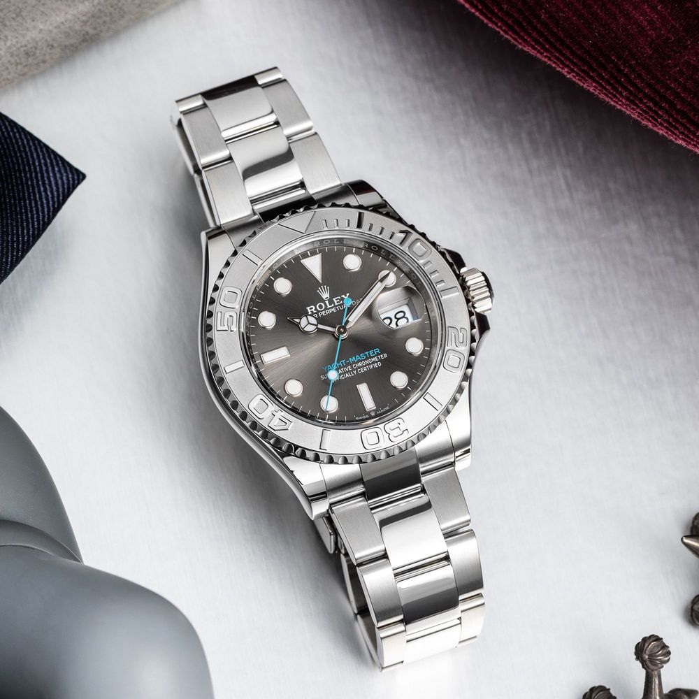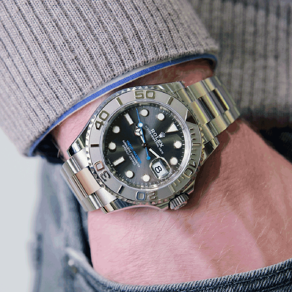 تتألق ساعة رولكس ياخت ماستر كنجمة ساطعة تجمع بين التصميم الرياضي واللمسات الكلاسيكية، حيث يلفت الإطار الدوار المصنوع من البلاتين انتباهك بلمعانه الفضي الذي يشبه أمواج البحر الهائجة. القرص الرمادي الداكن ينبض بحيوية، مع مؤشرات دائرية بيضاء لامعة تتوهج في الظلام كنجوم في سماء ليلية، وعقارب قوية تضمن دقة لا تشوبها شائبة. عند الساعة الثالثة، يظهر نافذة التاريخ بلون أزرق ناعم يضيف لمسة من الانتعاش، كأنها نسمة بحرية تلامس وجهك.