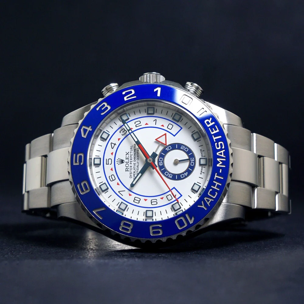 إحدى أبرز مزايا ساعة رولكس ياخت ماستر II ميرور أوريجنال هي استخدامها الفولاذ المقاوم للصدأ عالي الجودة الذي يحافظ على بريقه ويقاوم الخدوش مع مرور الوقت. السوار المعدني المصنوع بدقة يعكس الضوء بطريقة تبرز لمعانه، ما يجعلها قطعة لافتة للأنظار في أي تجمع رسمي أو كاجوال. تفاصيل المؤشرات والعقارب تم تصميمها بعناية كبيرة، مع لمسات زرقاء وحمراء تضفي حيوية وجرأة على مظهر الساعة، وتمنحها طابعًا رياضيًا مثاليًا لعشاق القوارب والريادة.