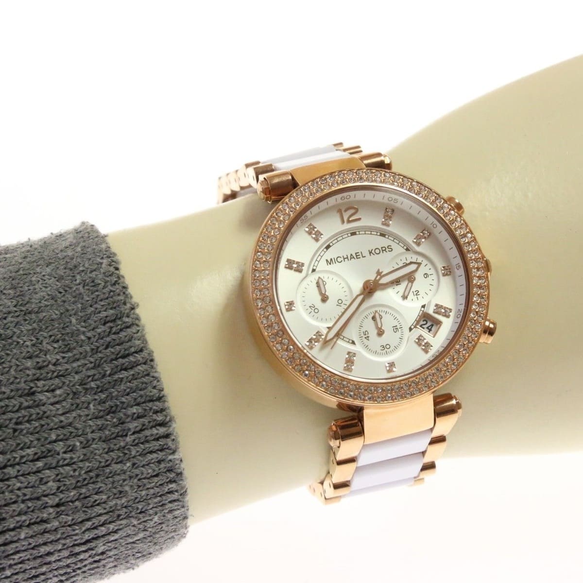 ساعة مايكل كورس للنساء اصلية موديل (باركر) Parker MK5774 بلون ابيض واستيك معدن بلون نحاسي وابيض