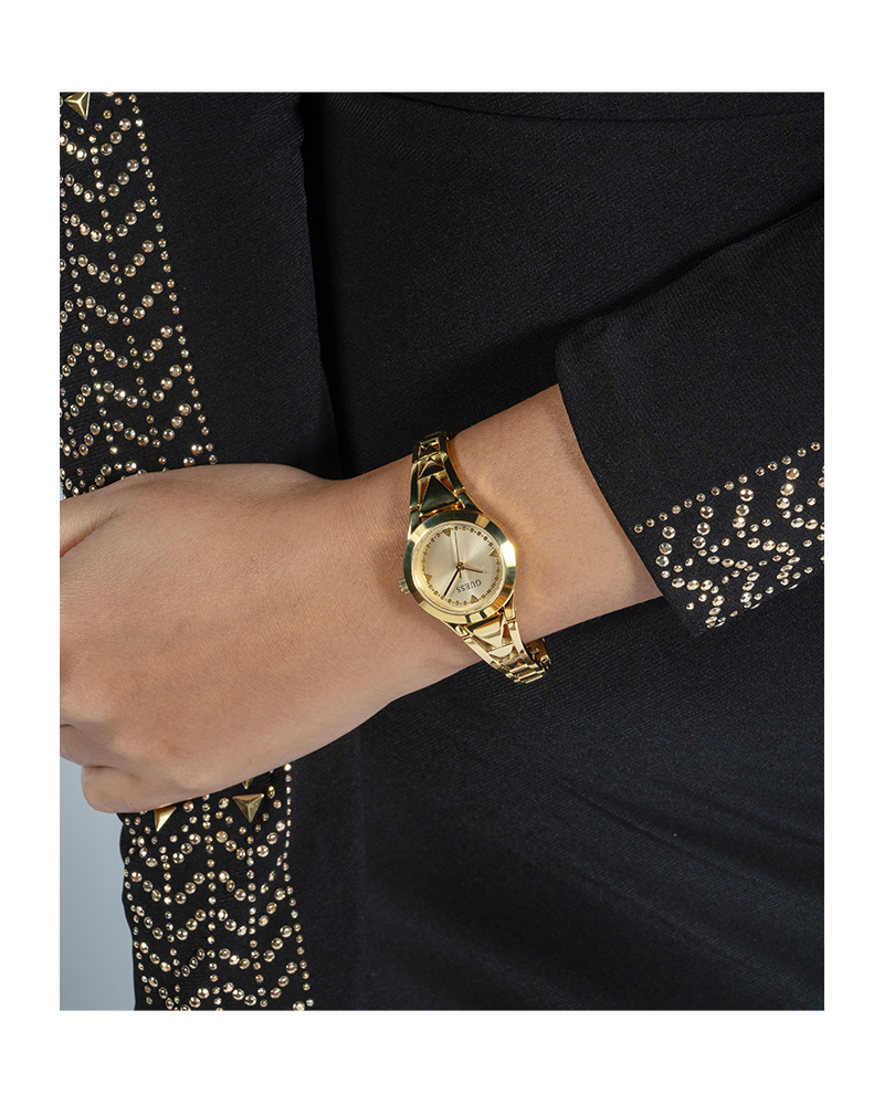 رقي يلفت الأنظار من اللحظة الأولى: قطعة ذهبية براقة تتحول على المعصم إلى توقيع شخصي للترف. ليست مجرد مقياس للوقت، بل مجوهرات متحركة تعلن ذوقاً رفيعاً وحضوراً واثقاً. تصميمها النحيف يمنحها خفة أنثوية، بينما يفيض السطح المصقول بلمعان فاخر يوازي بريق المناسبات الكبيرة. إنها الاختيار الذي تبحث عنه سيدة تعرف قيمة التفاصيل وتنتقي ما يليق بمكانتها.