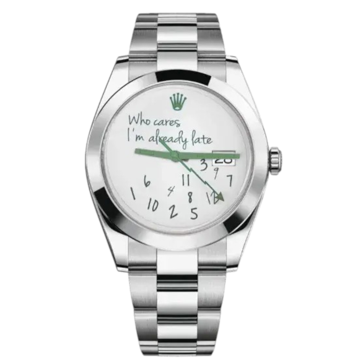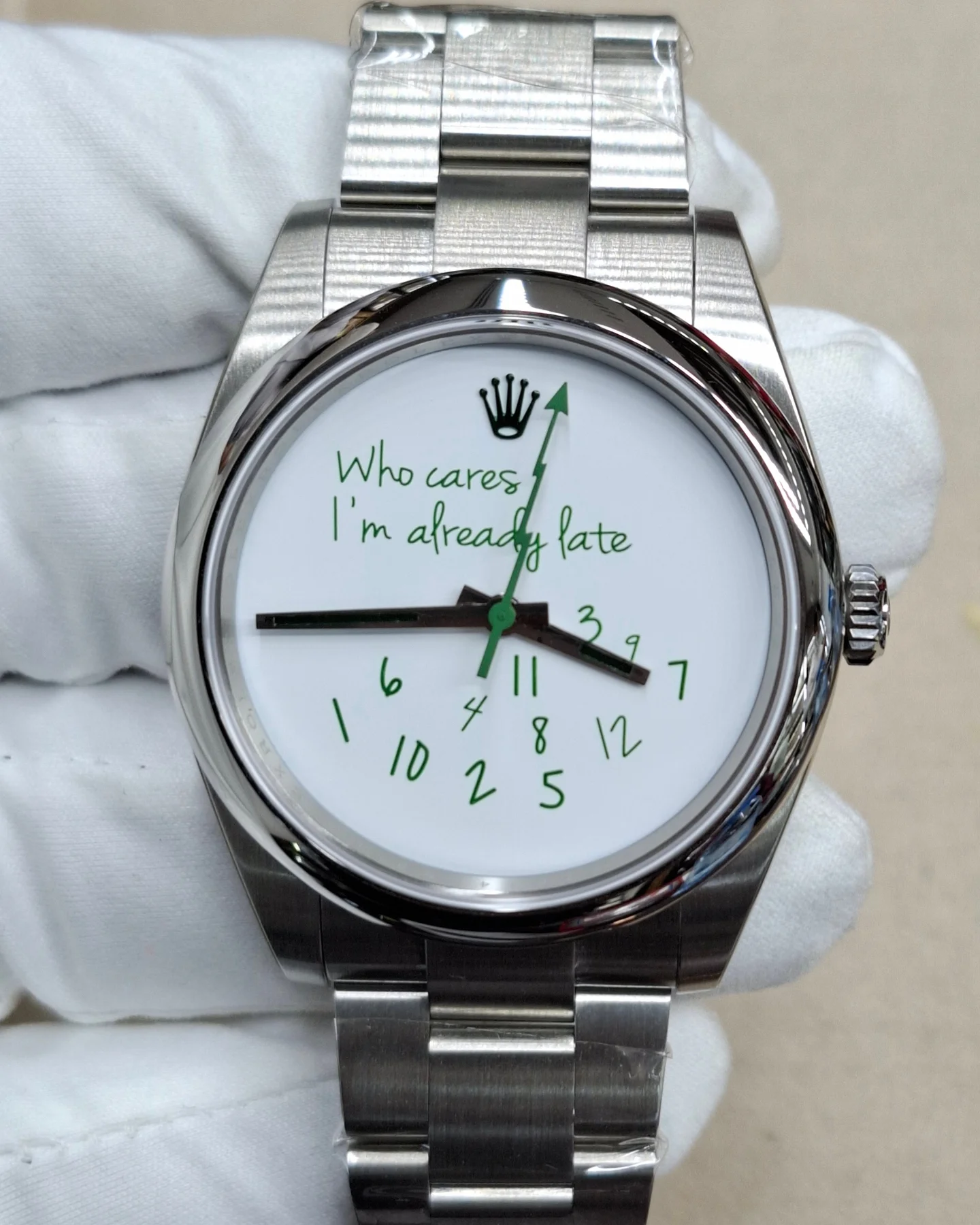 دعونا نغوص في تفاصيلها الساحرة: القرص الأبيض الناصع يشبه لوحة فنية حديثة، مزينة بخطوط خضراء مرحة تكتب عبارة “Who cares I’m already late” بأسلوب عفوي يدعو إلى الابتسام. الأرقام مبعثرة بطريقة إبداعية غير تقليدية – مثل 1 و6 و3 و5 و2 و0 و7 و1 و10 و2 و5 – كأنها ترقص بحرية على سطح الساعة، مضيفة لمسة من الفكاهة والتمرد على الروتين اليومي. العقارب الخضراء الرفيعة تشير إلى الوقت بدقة مذهلة، بينما التاج الشهير برمز التاج يعلو القرص بفخر، يذكرك بتراث روليكس العريق في صناعة الساعات الفاخرة.